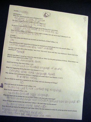 [Actually I try never to be in front of the class more than about 15 minutes per class period. My CES supervisor has really stressed that the students should have some time with the scriptures (studying them with some directed purpose), some time sharing what they learned with the other students, and some time to write/record in some way their thoughts and testimonies regarding what they’ve learned. That’s why I’m always trying to create some kind of hands-on activity to guide the students toward these kinds of moments. I will be the first to admit that I may not be perfect in achieving this, but I continue to try! :0) ]