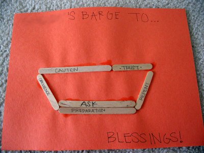We closed by having them create their own personal barges of faith by arranging their petition sticks on the paper and gluing them in place. The kids could choose whether they wanted to place their petitions right-side up or the obedience-reminder sides right-side up for their barges – whichever felt the most important to remember for them.