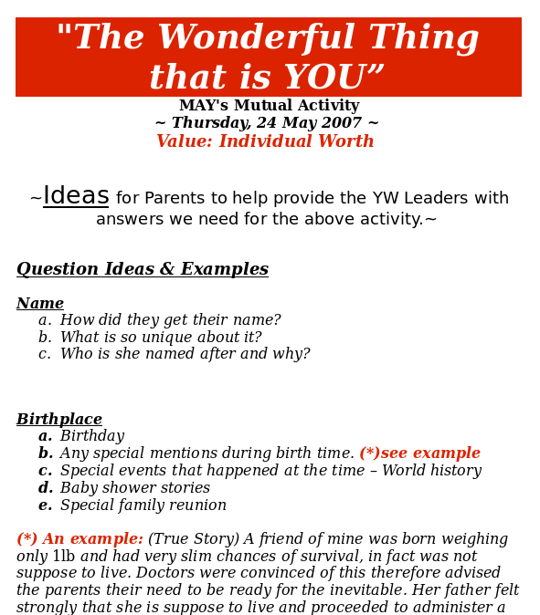 3rd Activity – We contacted the mothers about a month before the activity and asked them to write about their daughter/s we gave them an outline of what they could write, we asked the mothers to get it back to us as soon as they could and not to let their daughters know about the activity we wanted it to be a surprise. We typed up what they had written on nice paper and put some graphics that related to that particular girl. We had them rolled up and tied with ribbon in a basket. We chose one at a time out of the basket called that young woman to come and stand at the front of the room while we read out what her mother had written about her. There were lots of tears, the young women felt really loved and the night was a huge success.