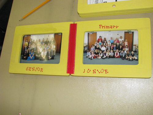 – painted picture frames with Junior and Senior Primary in them; frames were attached to each other using a wide piece of ribbon hot glued to the frame