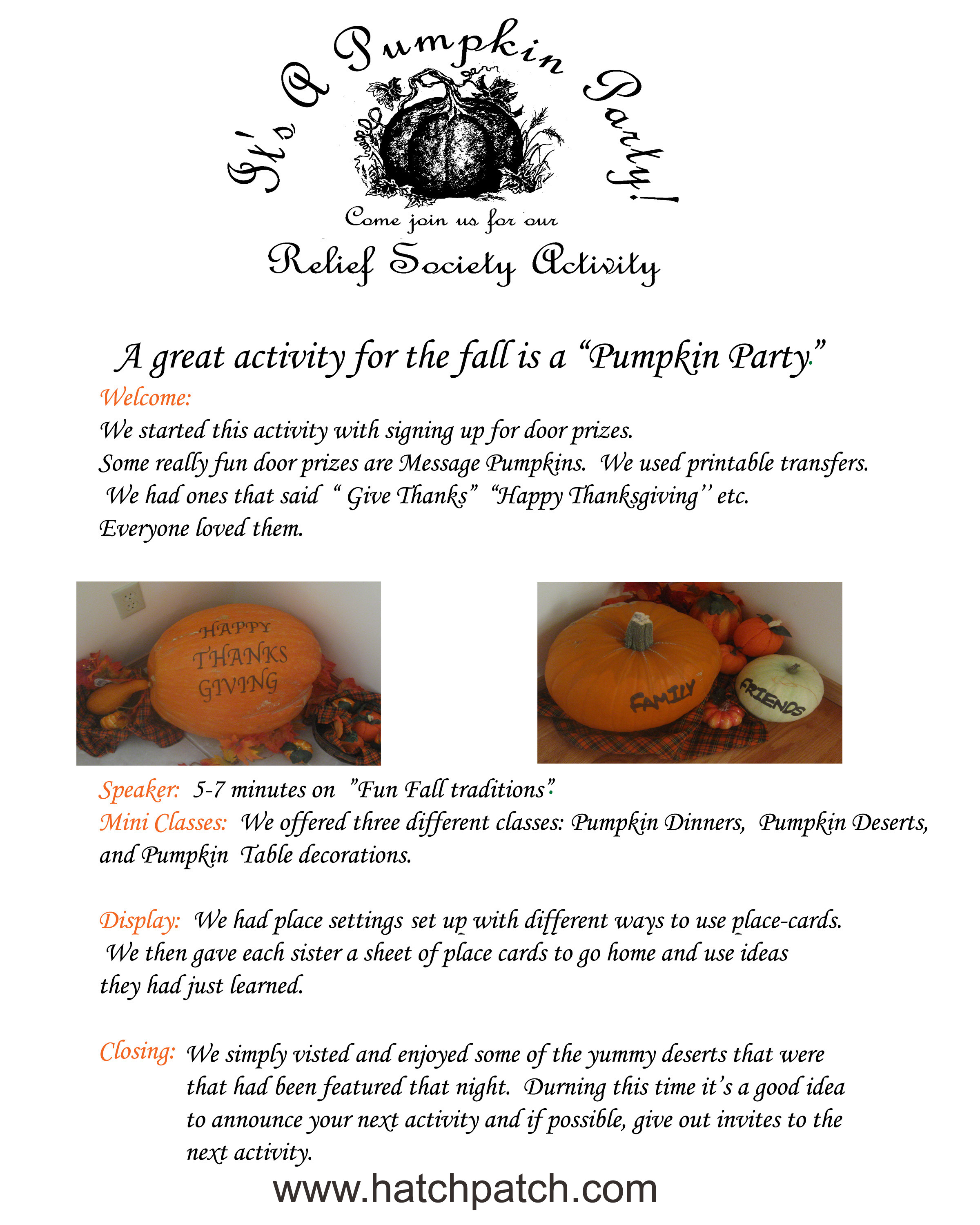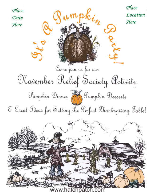 This is a great activity for the fall. We chose to have this at one of the sisters homes. I’m attaching the Info sheet, a flier you can use, and the name cards we used for one of the activites. This evening was a lot of fun, it helped us get in the mood for all the Fall holidays.