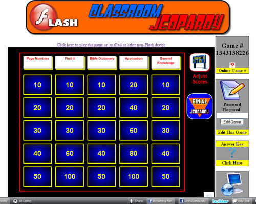 Click the following link and enter the data to play online (also includes iPad or non-flash version): http://www.superteachertools.com/jeopardy/usergames/Jul201230/game134313… Here is the link to the answer key with the questions and answers below: http://www.superteachertools.com/jeopardy/answerkey.php?game=1343138226