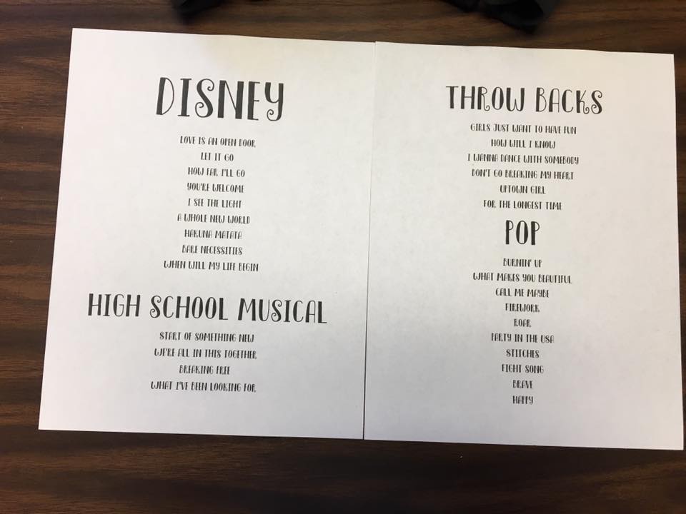 - “We just did shake it off by Taylor Swift (editing out two phrases) and everyone loved it.” (Amanda) “We did that also & dressed the different parts.” (Sonia)
