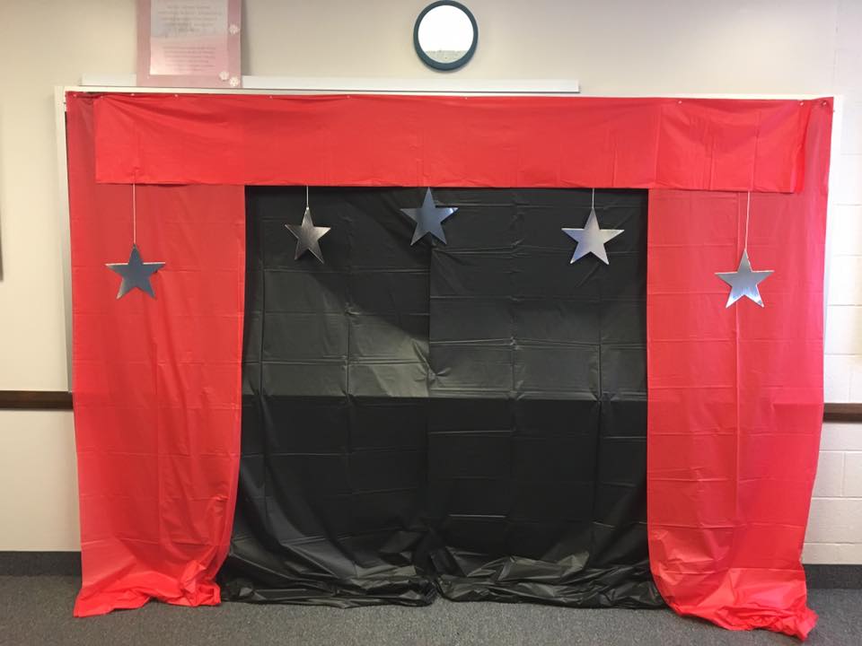 Here is how one unit set up a “stage”. It looks like they used plastic tablecloths from the dollar store and pinned them to a chalkboard in a classroom.