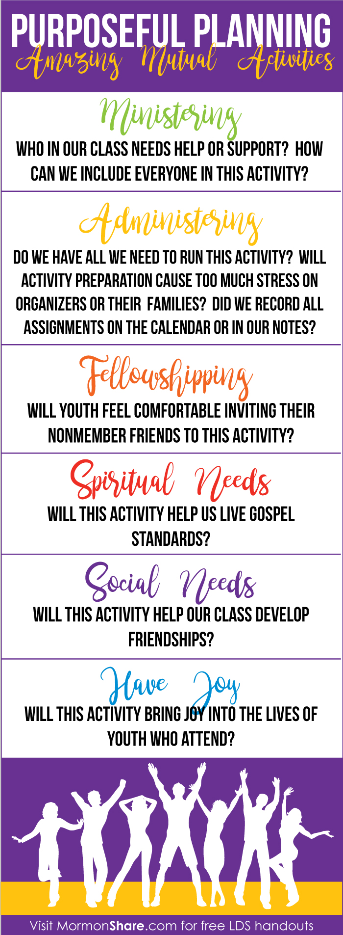 Our ward held a combination leadership/planning meeting last Sunday before Conference. This handout contains some of the information that we discussed during our training. Plan an amazing mutual activity with these tips. Your activity does not need to match all of these items, but it